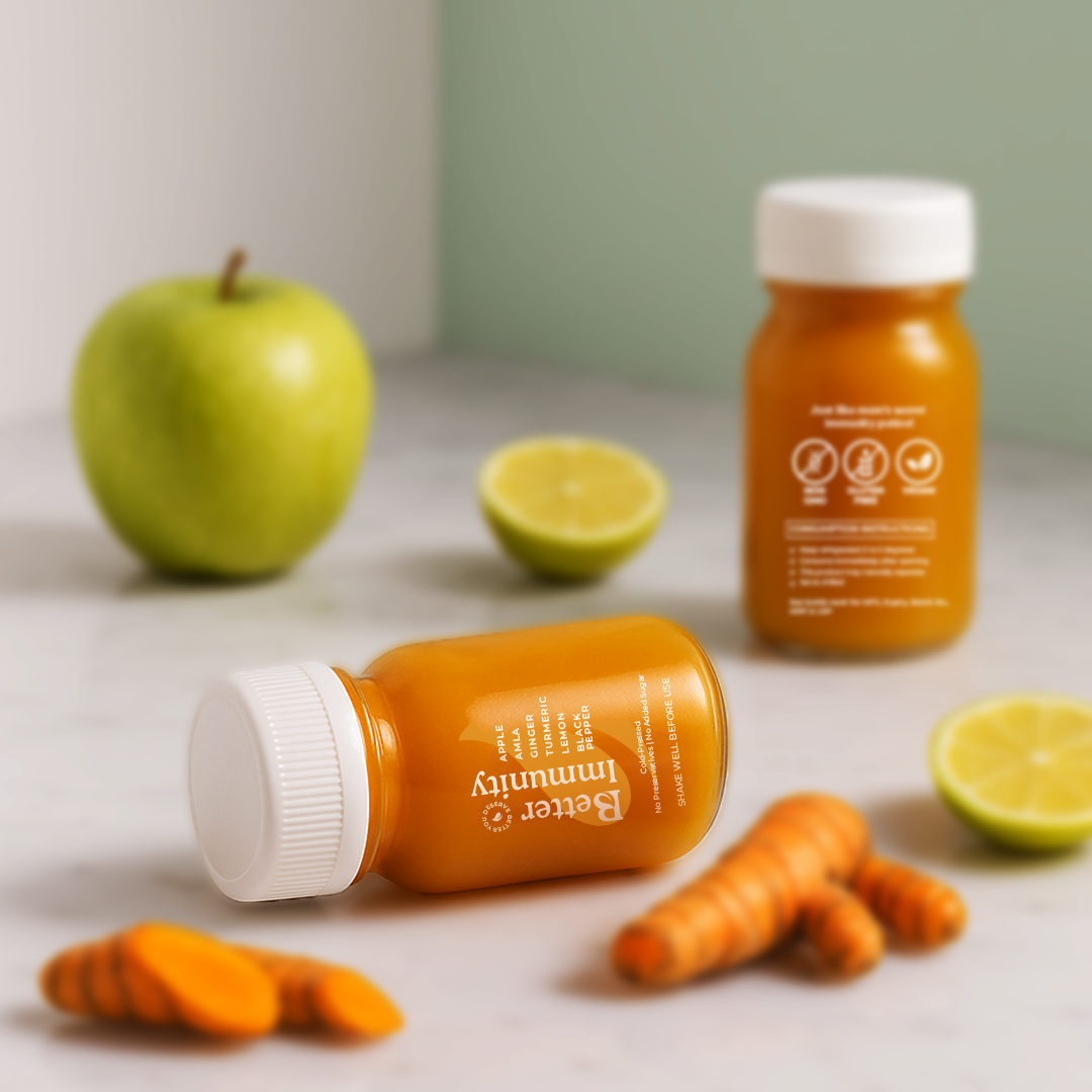 Better Immunity is a 100ml cold-pressed wellness shot made with apple, amla (Indian gooseberry), lemon, turmeric, ginger, and black pepper. It’s designed to naturally support your immune system with powerful antioxidants, vitamin C, and anti-inflammatory benefits.